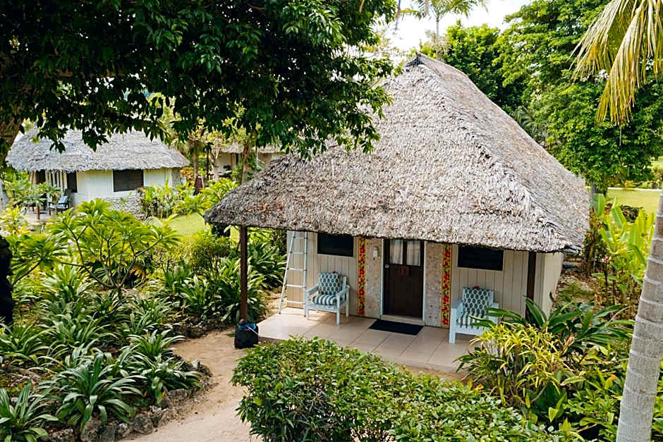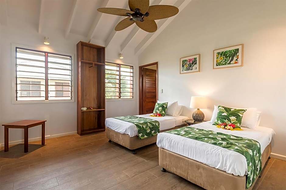 This bungalow overlooks the mini-golf course and has some ocean views. It also includes a separate bedroom with a queen-sized bed, a large wardrobe and an private bathroom. The lounge area is furnished with sofas, a table and chairs, small kitchenette, ceiling fan and 3 single-sized beds. The bungalow is decorated with local hardwood timber furniture, artwork from local artists, soft furnishings exclusively designed for the resort and ceramic tiling.
